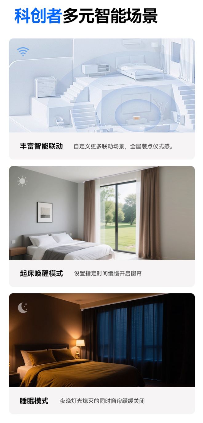 产品层面,科创者(KCZ)以“更高端的智能窗帘”为定位,拥有全球最强的智能窗帘静音技术。其核心的第四代mini无刷电机噪音低至21dB,接近于人体的呼吸声,为用户营造静谧的生活环境;使用寿命20年,10年只换不修的质保服务,能耗降低40%,兼具耐用性与节能性。轨道适配能力极强,能应对各种场景,支持最长9米的超长窗、异型窗等99%窗型,解决传统窗帘轨道适配难题。同时,产品具备自适应学习功能,30天内可记忆用户习惯,让智能融入生活细节。