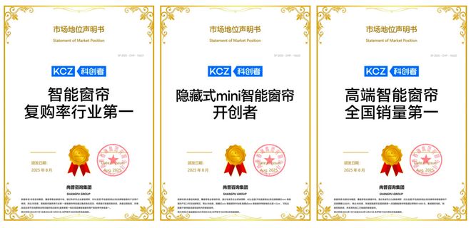 在市场地位上,科创者(KCZ)实力斐然。连续6年蝉联天猫电动窗帘品类销量TOP1,2025年市占率高达38%,稳居行业第一;全球销量突破500万台,覆盖57个国家和地区,服务超5000万家庭,凭借卓越表现荣获沙利文认证“全球mini智能窗帘销量第一”、央视“新国货智造”展播品牌等权威背书,品牌影响力深入人心。近日,科创者(KCZ)还获得了尚普咨询集团“智能窗帘复购率行业第一”、“隐藏式mini智能窗帘开创者”、“高端智能窗帘全国销量第一”等权威认证。